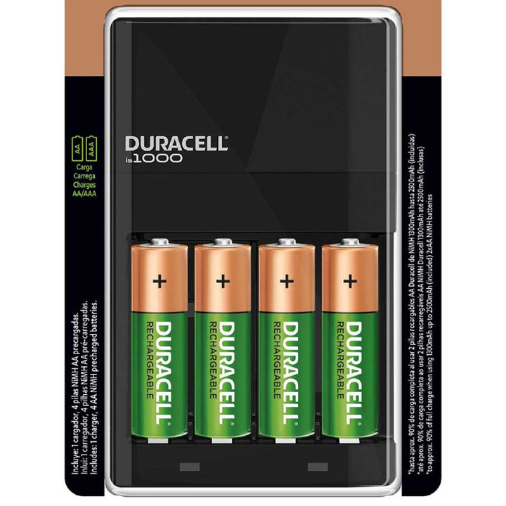 Cargador duracell incluye 4 pilas aa 2500 mah precargadas puedes cargar 2 o 4 baterias al mismo tiempo cargador para pilas aa y aaa recarga de 4 a 8 horas garantia 10 años o hasta 400 cargas.